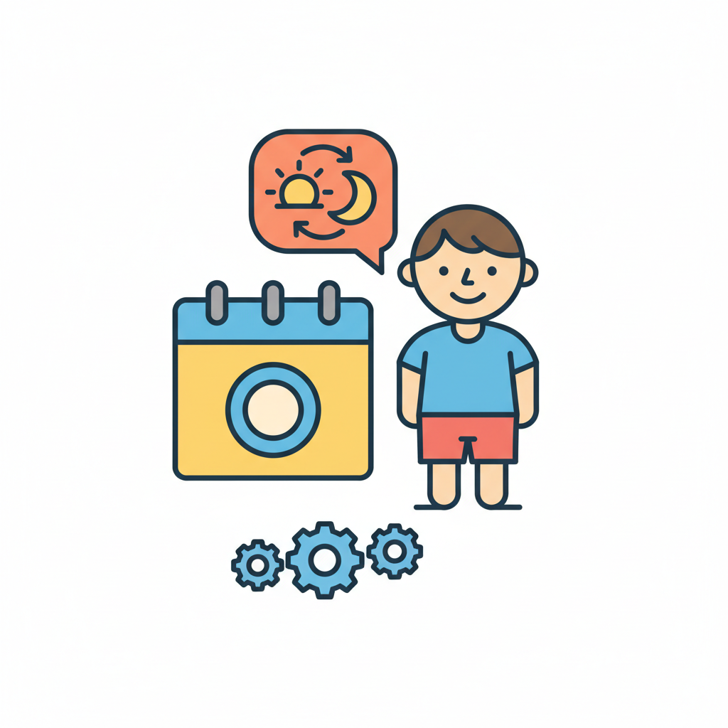 Ein Junge, Kalender, Sprechblase mit Tag/Nacht-Zyklus und Zahnräder symbolisieren Routine.