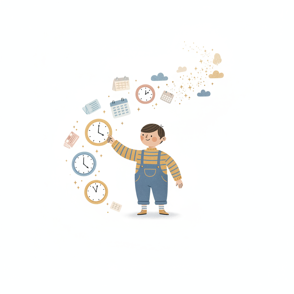 Cartoonjunge umgeben von Uhren und Kalendern, die Zeit und Planung symbolisieren.