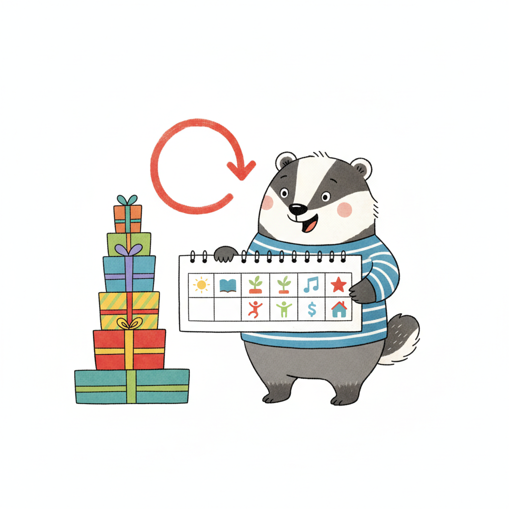 Ein fröhlicher Dachs mit Kalender und Geschenkturm, symbolisiert Planung und Belohnung im Kreislauf.