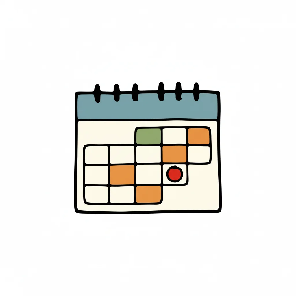Cartoon-Kalender mit hervorgehobenen Tagen und einem roten Punkt für einen Termin.