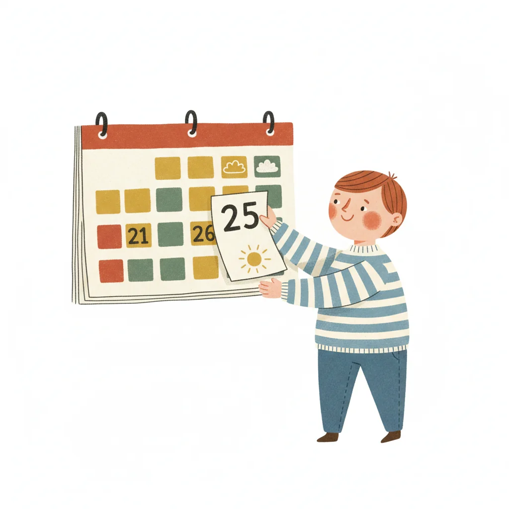 Ein lächelnder Junge hängt ein Kalenderblatt mit der Zahl 25 und einem Sonnensymbol auf.