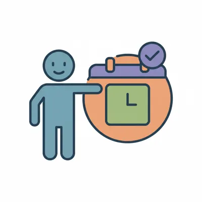 Stilisierte Person zeigt auf einen Kalender mit Uhr und Häkchen, symbolisiert Terminplanung.