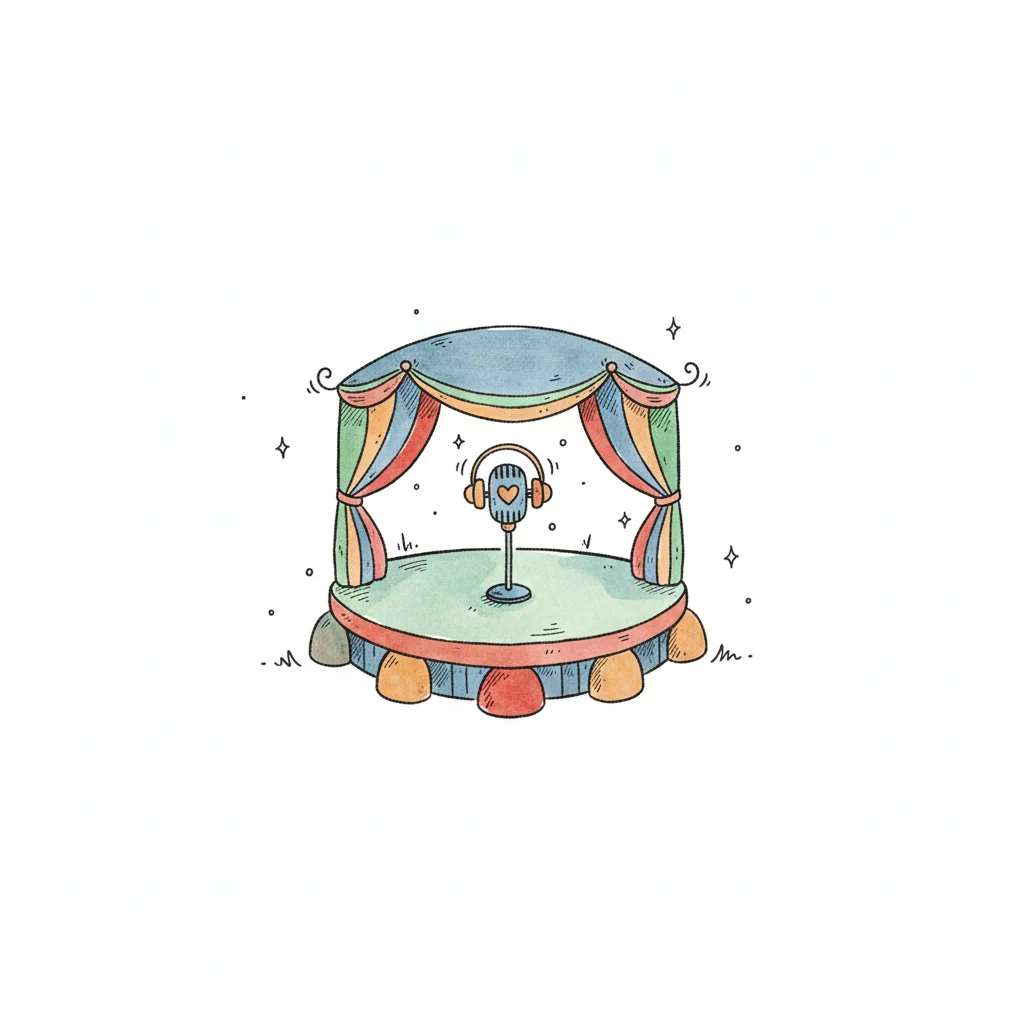 Niedliche, bunte Cartoon-Bühne mit Mikrofon und Kopfhörern, bereit für Musik oder Podcast.
