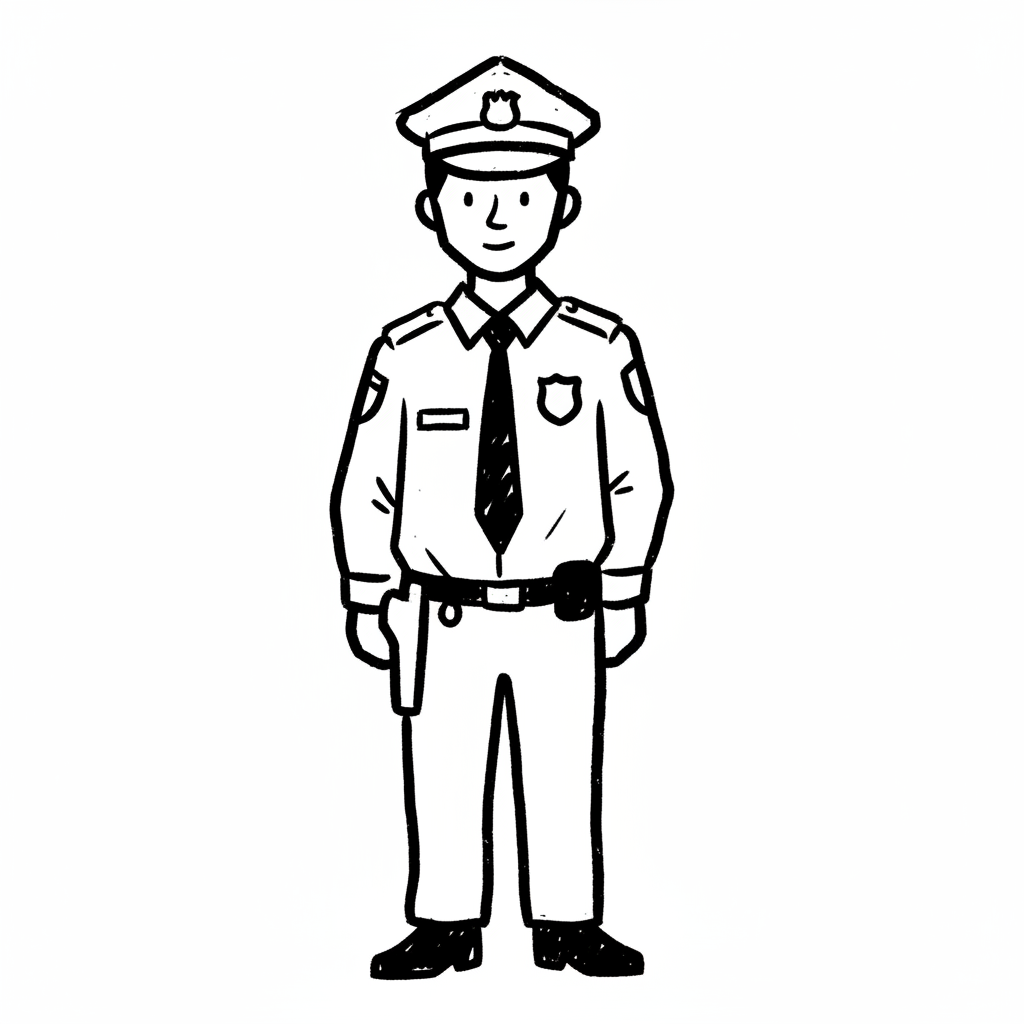 Einfache, handgezeichnete Illustration eines lächelnden Polizisten in voller Uniform.