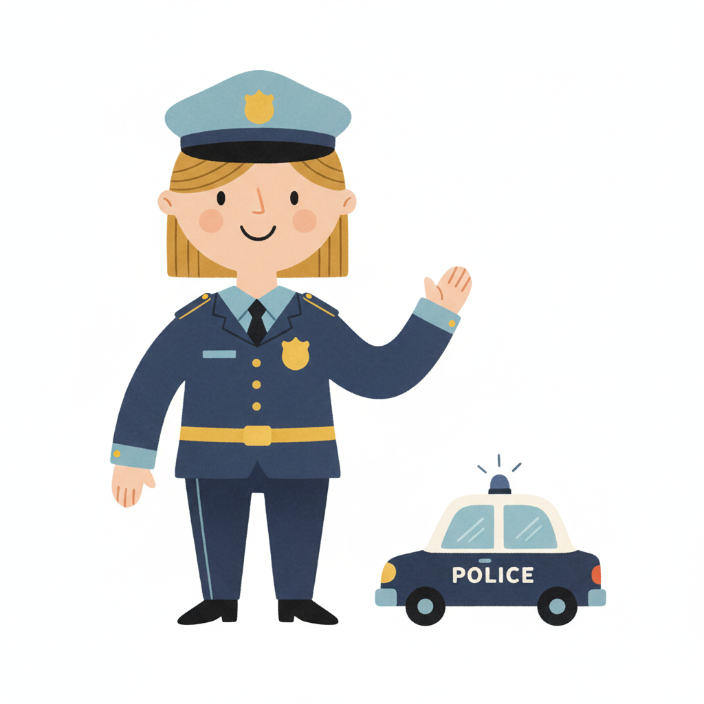 Illustration einer lächelnden Polizistin in blauer Uniform und Mütze.