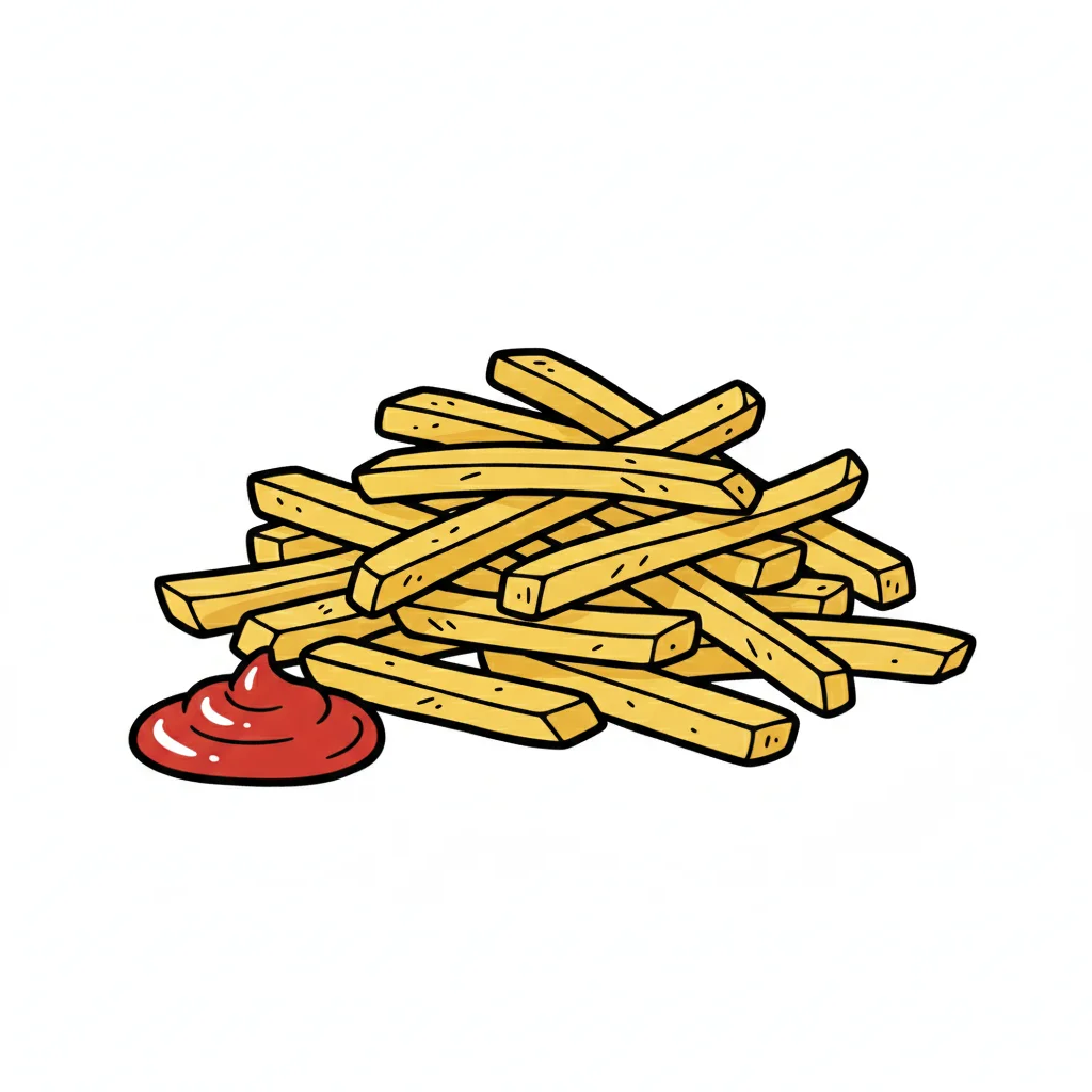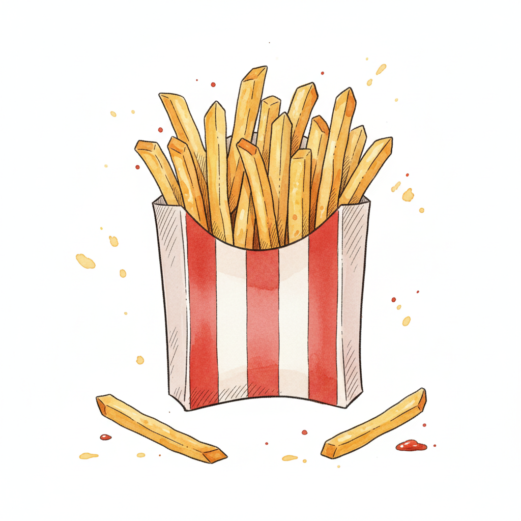 Eine Skizze von Pommes Frites in einer Papiertüte.