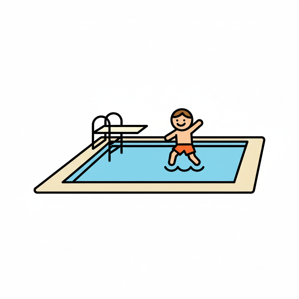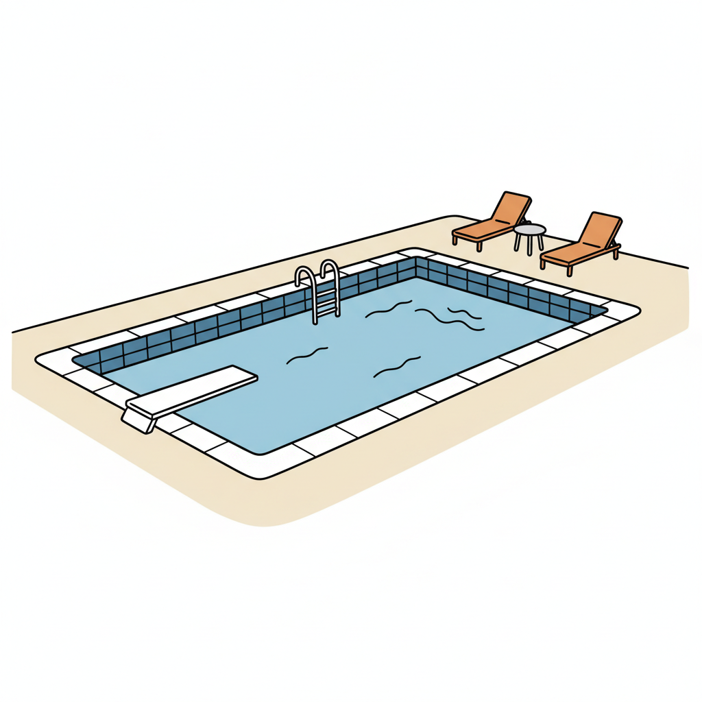 Ein skizzierter Pool mit Spritzwasser und einer Sprunganlage.