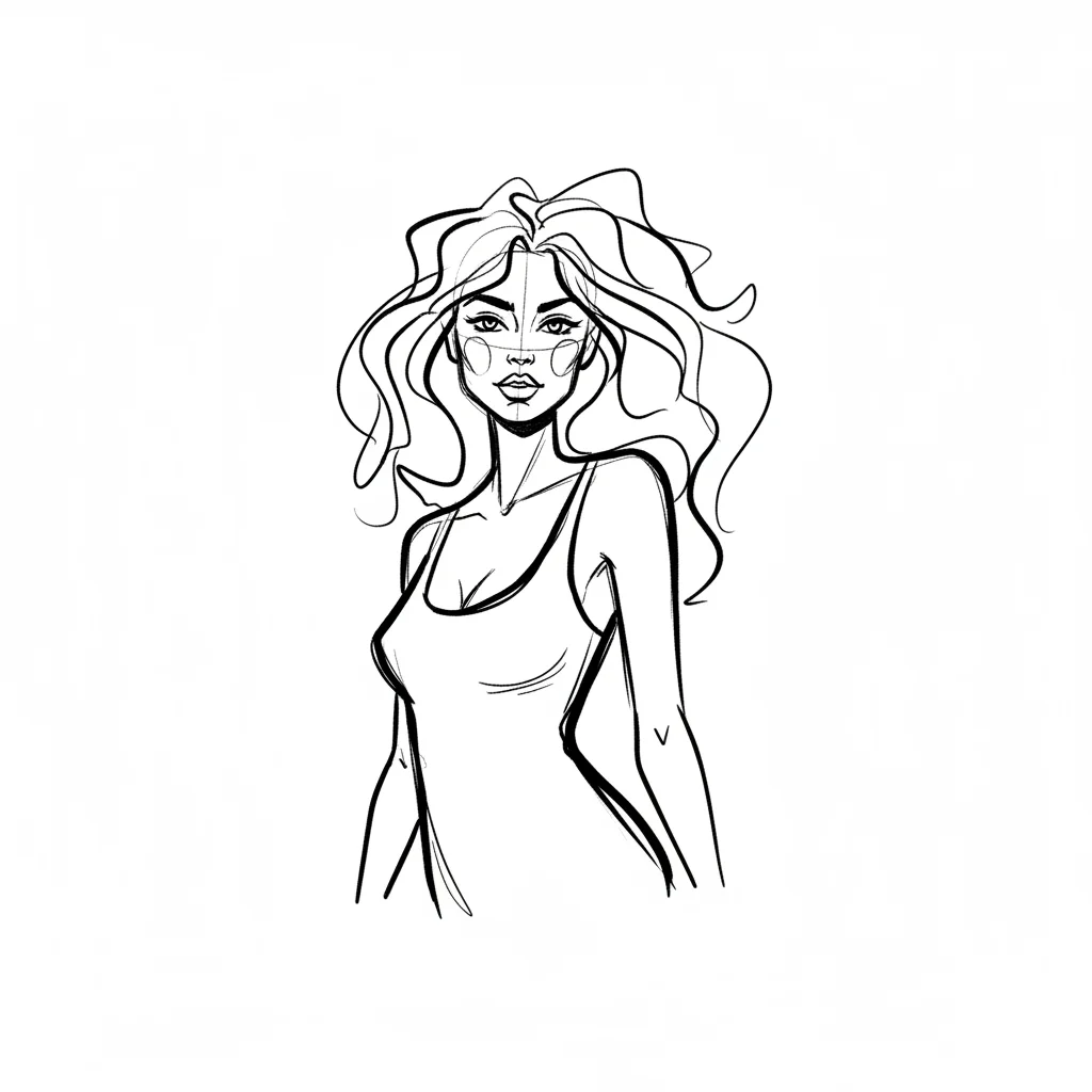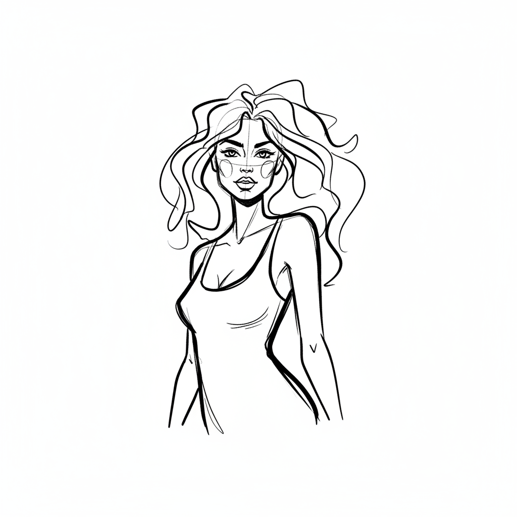 Eine stilisierte Zeichnung einer Frau mit wilden Haaren und einem lässigen Outfit.