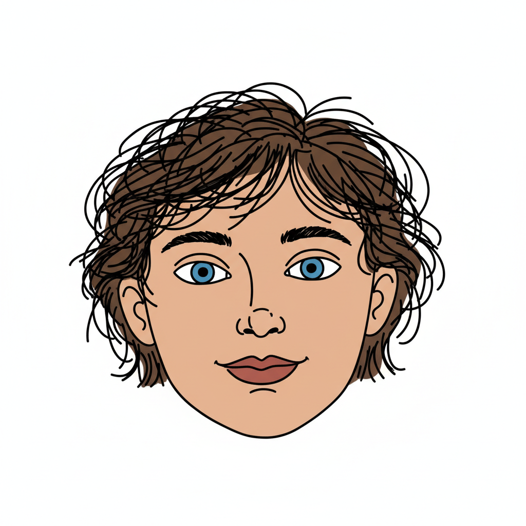 Illustration eines jungen Gesichts mit lockigem Haar und blauen Augen.