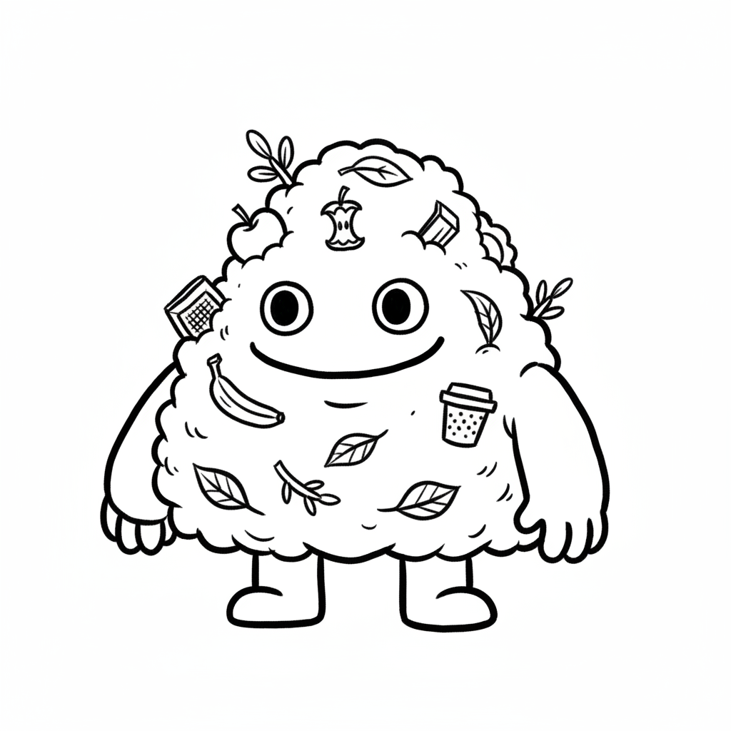 Ein lustiger, fluffiger Charakter mit Pflanzen- und Abfall-Elementen.