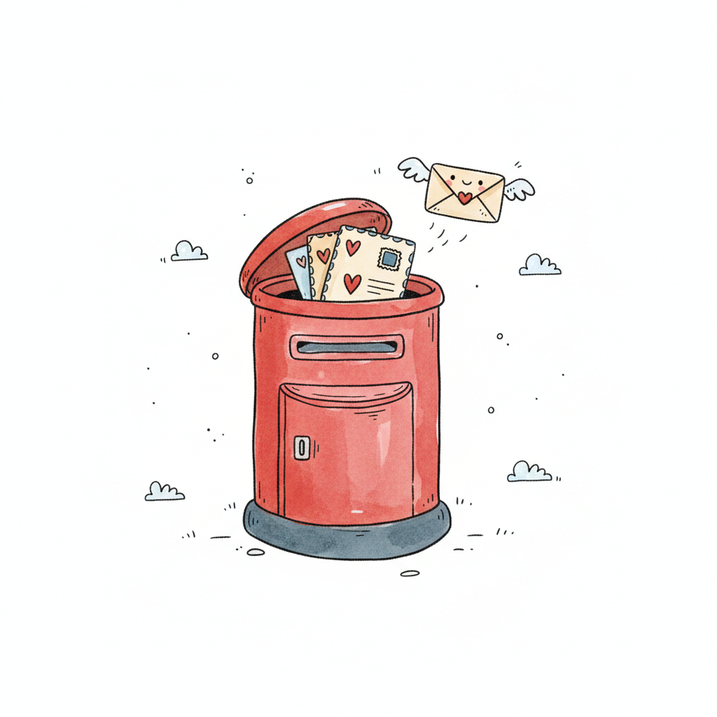 Rote Postbox mit fliegenden Briefen, die Herzen zeigen.