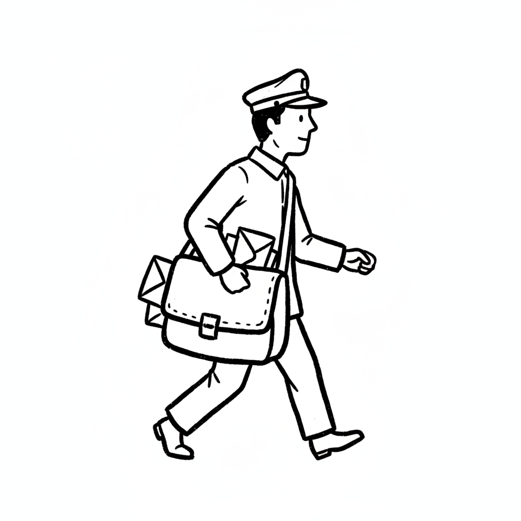 Ein Postbote trägt Briefe und geht mit einer Tasche.