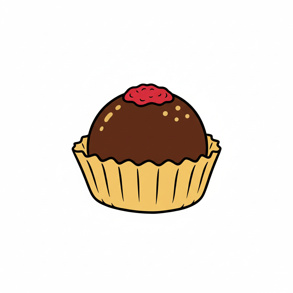 Eine schokoladene Praline in einer Papierhülle mit roter Dekoration.