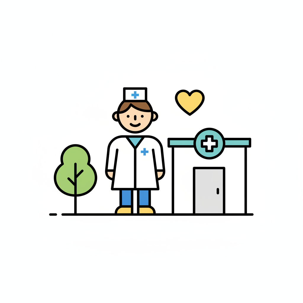 Freundlicher Arzt/Pfleger vor Klinikgebäude mit Baum und Herz. Symbolisiert Gesundheitswesen.
