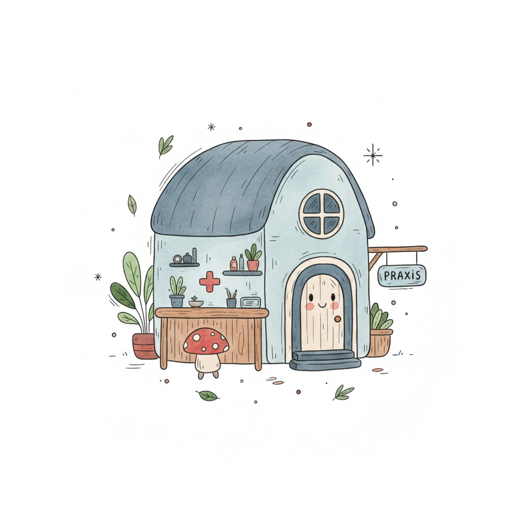 Niedliches, märchenhaftes Praxis-Haus mit lächelnder Tür, Pflanzen und rotem Kreuz im Aquarellstil.