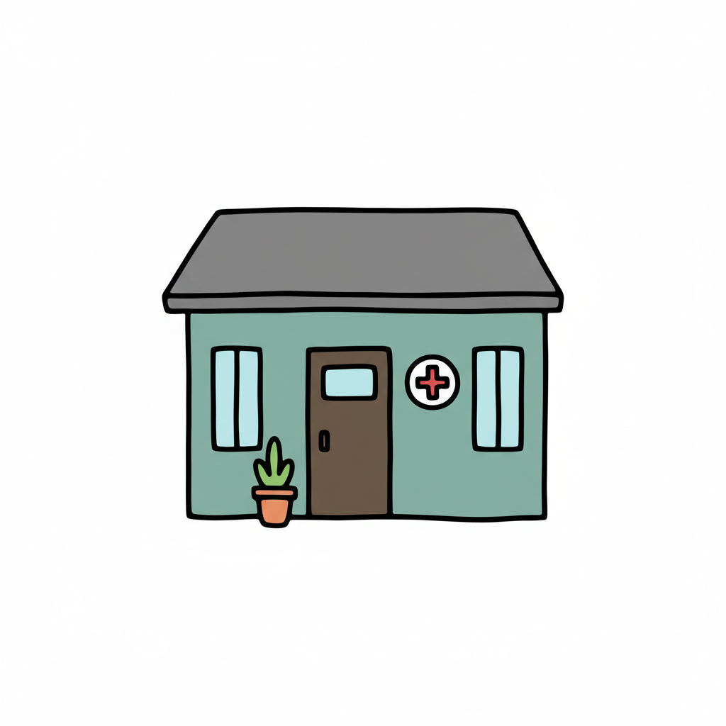 Schwarz-weiße Doodle-Zeichnung einer kleinen Klinik oder Arztpraxis mit Baum und Empfangsbereich.