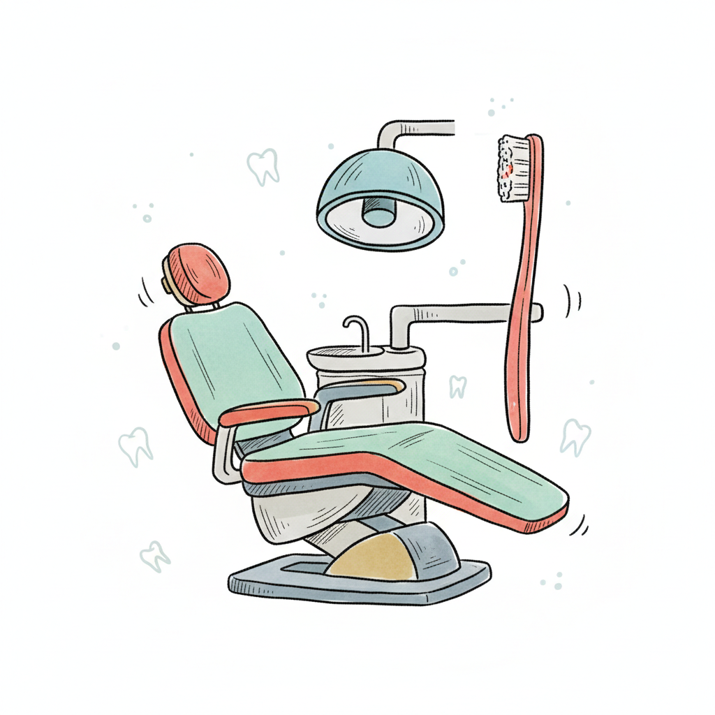 Bunte Illustration einer Zahnarztpraxis mit Behandlungsstuhl, Lampe, Spuckbecken und Zahnbürste.