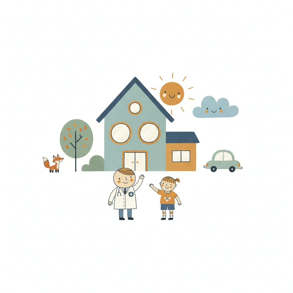 Niedliche Illustration von Arzt und Kind vor einem Haus mit Sonne, Wolke, Fuchs und Auto.