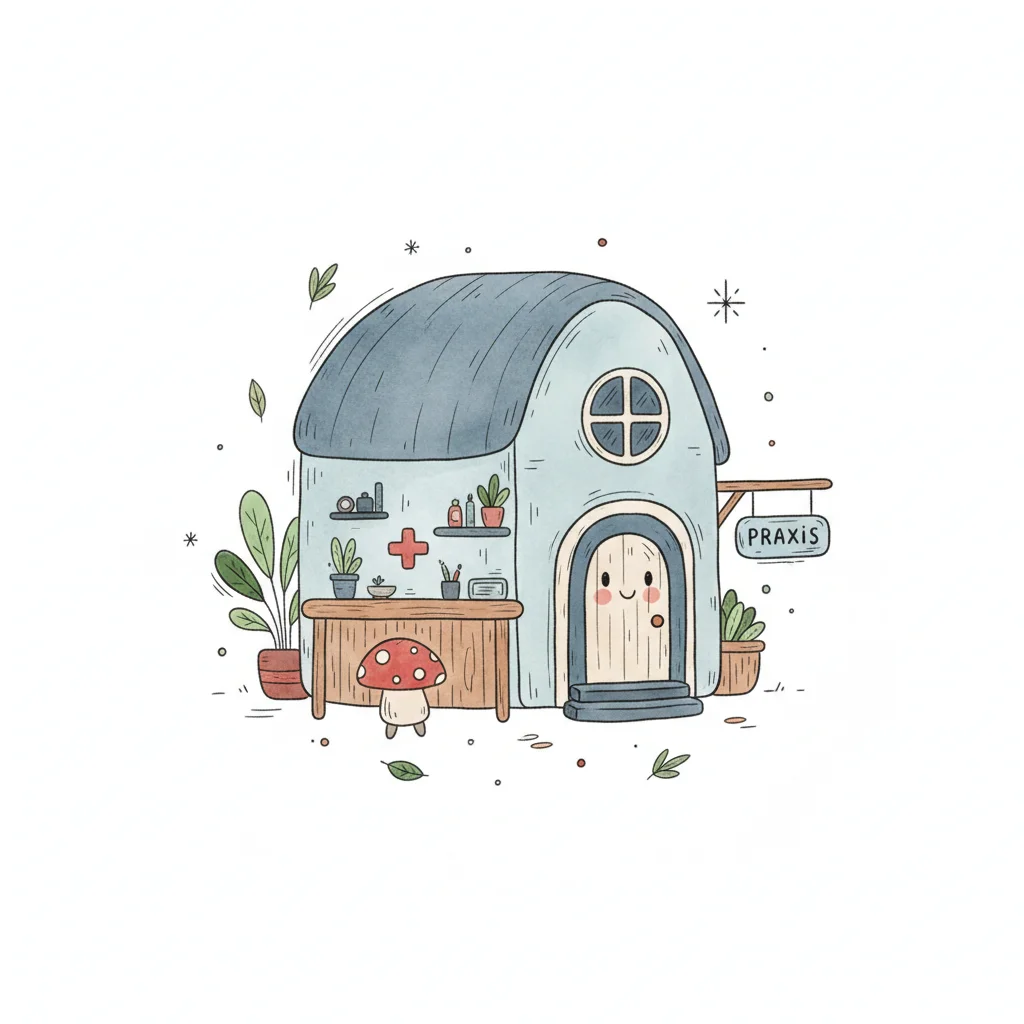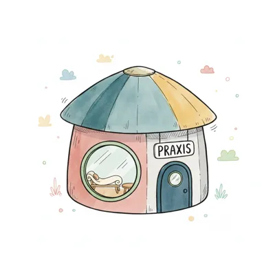 Freundliches Cartoon-Praxisgebäude mit buntem Dach und Therapiecouch im runden Fenster.