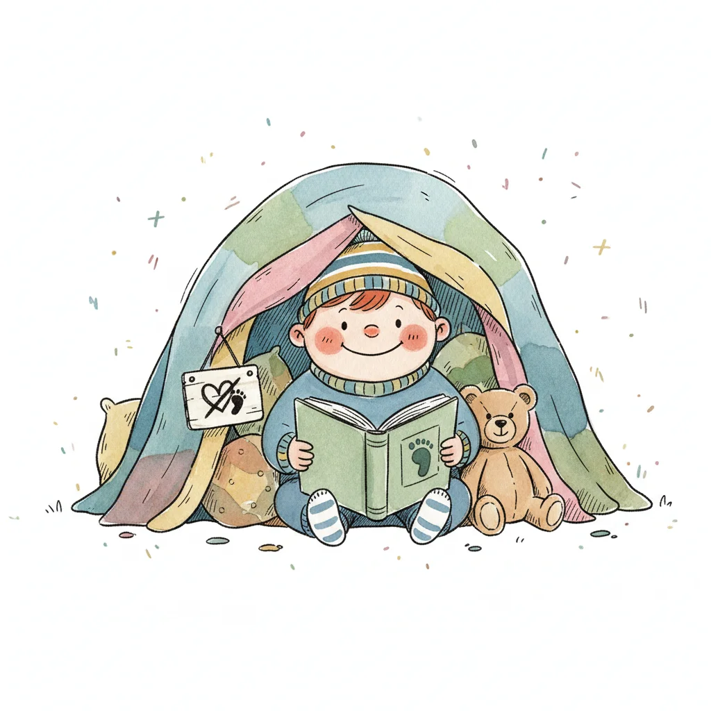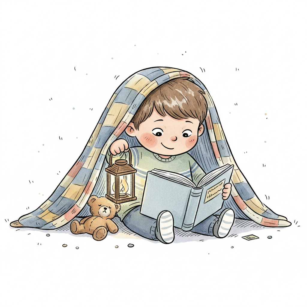 Fröhliches Kind liest Buch in gemütlicher Deckenhöhle, begleitet von Teddybär.