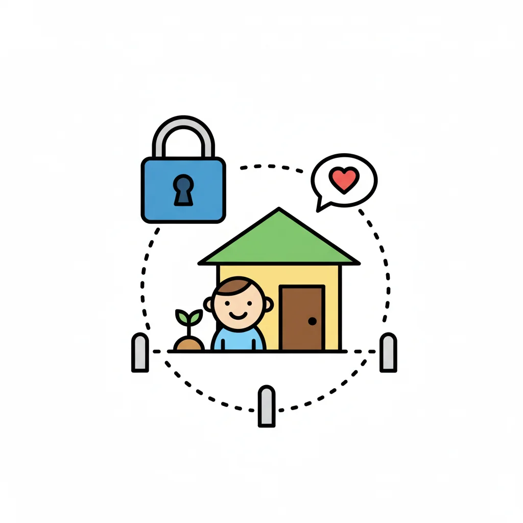 Ein Haus mit Person und Pflanze, umgeben von einem Zaun, mit Schloss und Herz für Sicherheit und Liebe.