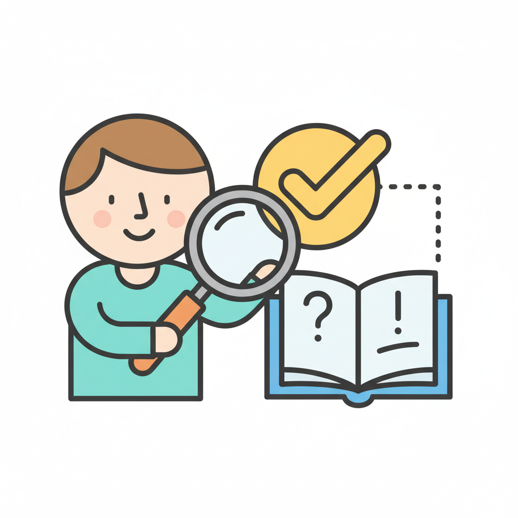 Person mit Lupe erforscht ein Buch mit Fragen und Antworten, symbolisiert durch einen Haken.