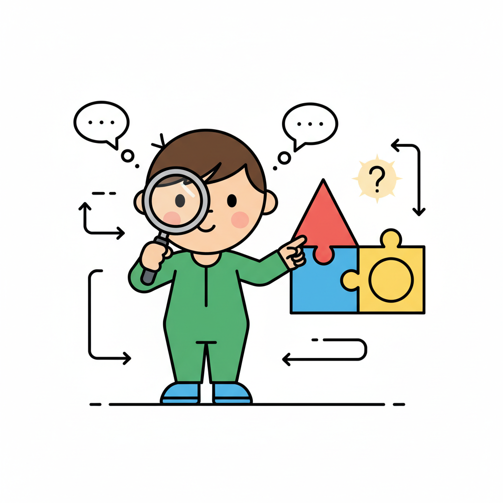Kind mit Lupe untersucht bunte Puzzleteile, symbolisiert Problemlösung und Entdeckung.