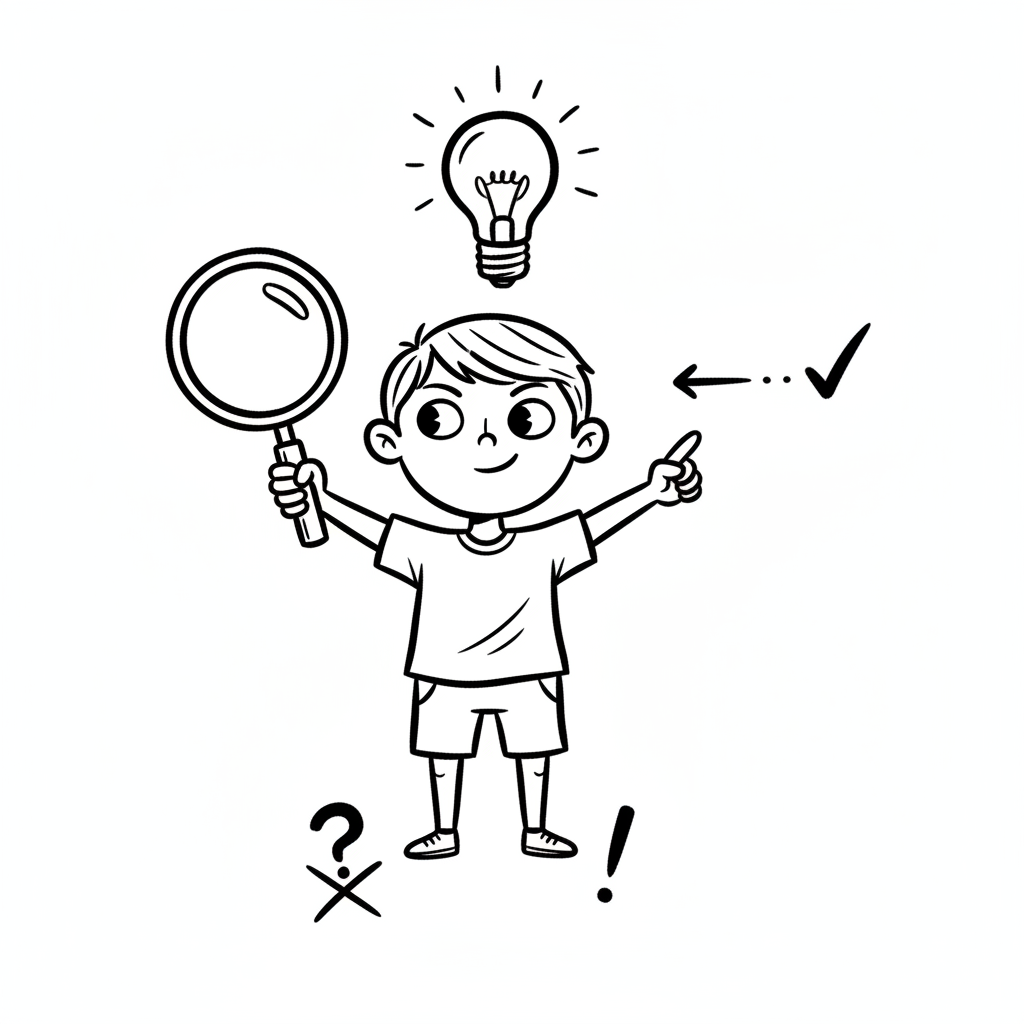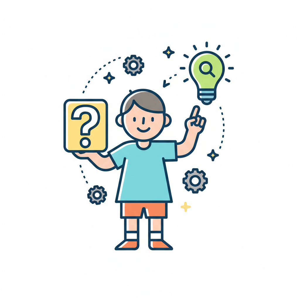 Ein lächelnder Junge hält ein Fragezeichen und einen Haken, umgeben von Symbolen für Ideen und Lösungen.
