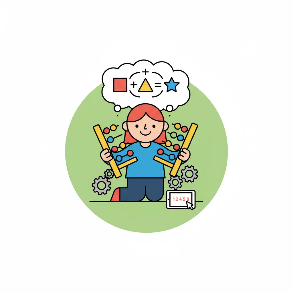 Mädchen löst Probleme mit Rechenstäben, Zahnrädern und denkt an mathematische Gleichungen.