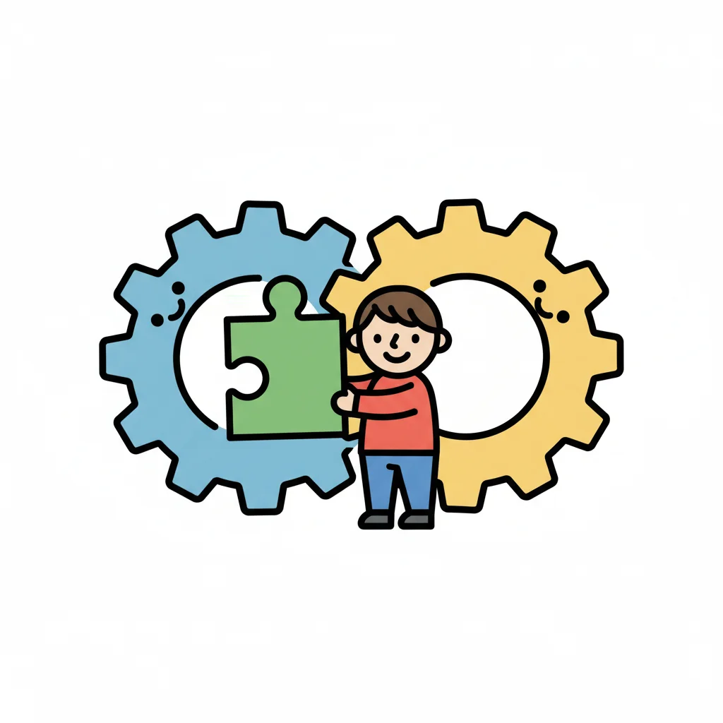 Eine Person fügt ein Puzzleteil in ein Zahnrad ein, symbolisiert Problemlösung und Integration.