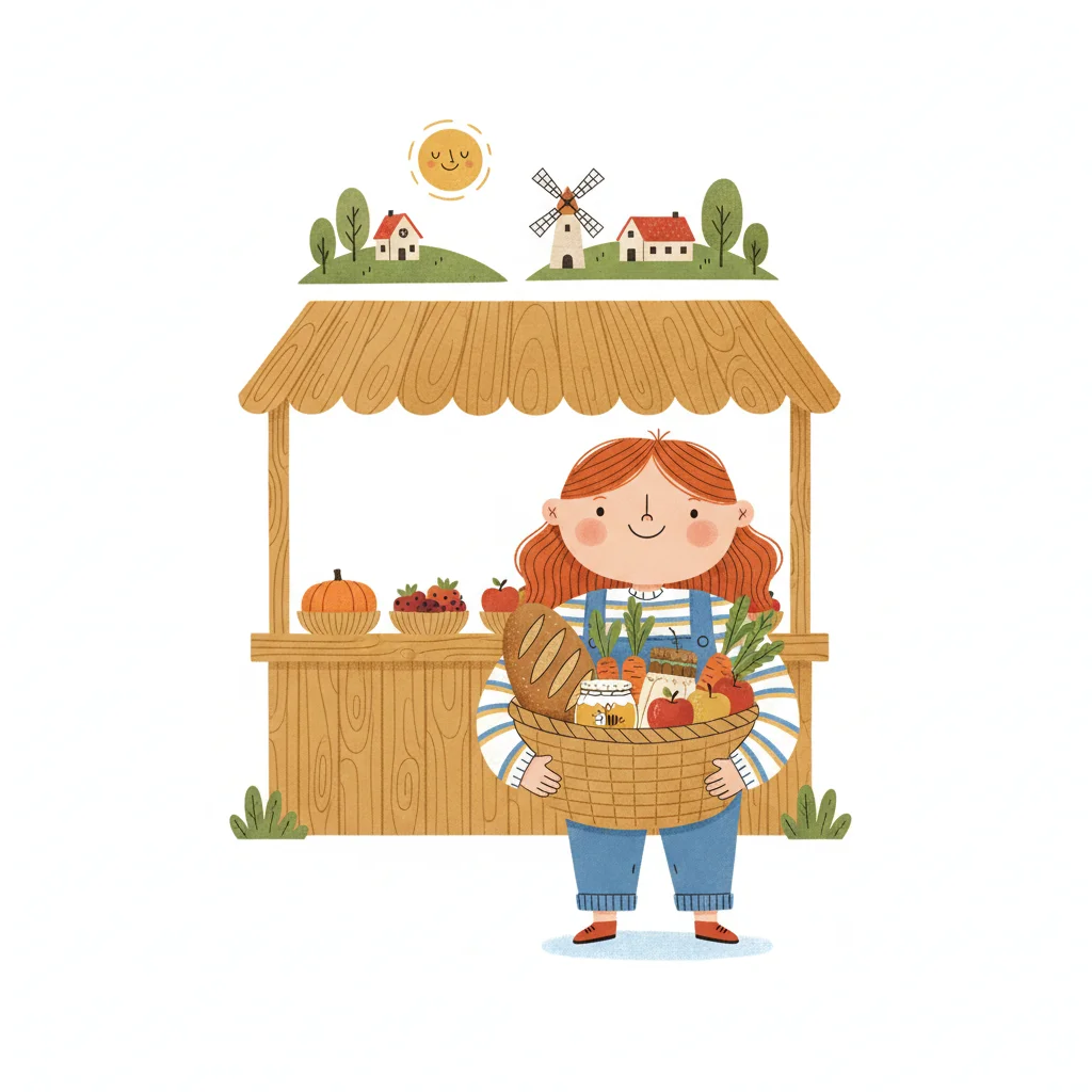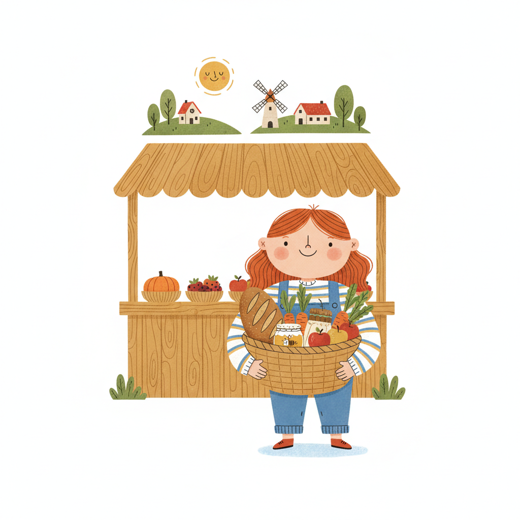 Niedliche Cartoon-Bäuerin mit Korb voller frischer Produkte vor einem Marktstand und ländlicher Kulisse.