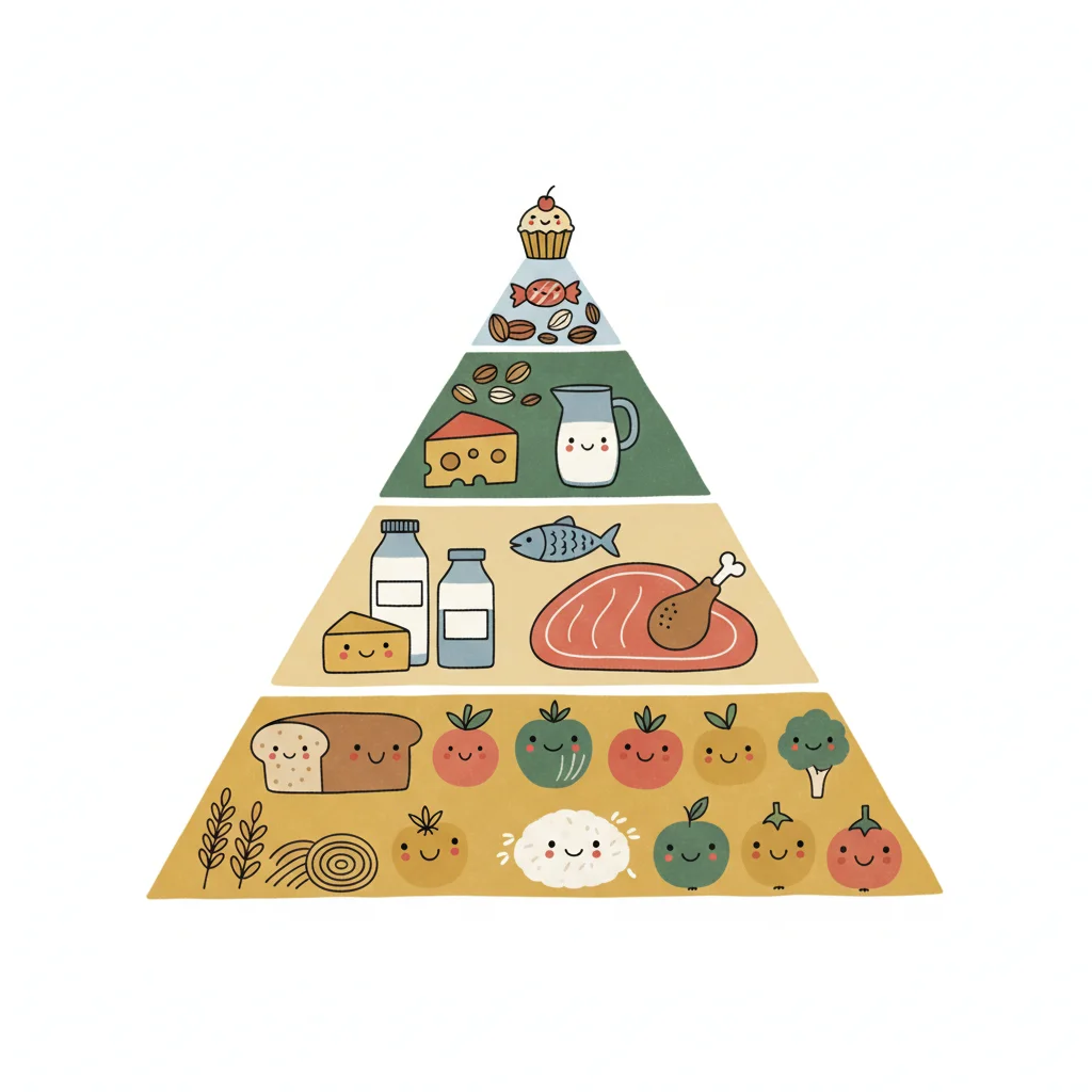 Bunte Lebensmittelpyramide mit fröhlichen Gesichtern auf Obst, Gemüse, Milchprodukten und Süßigkeiten.