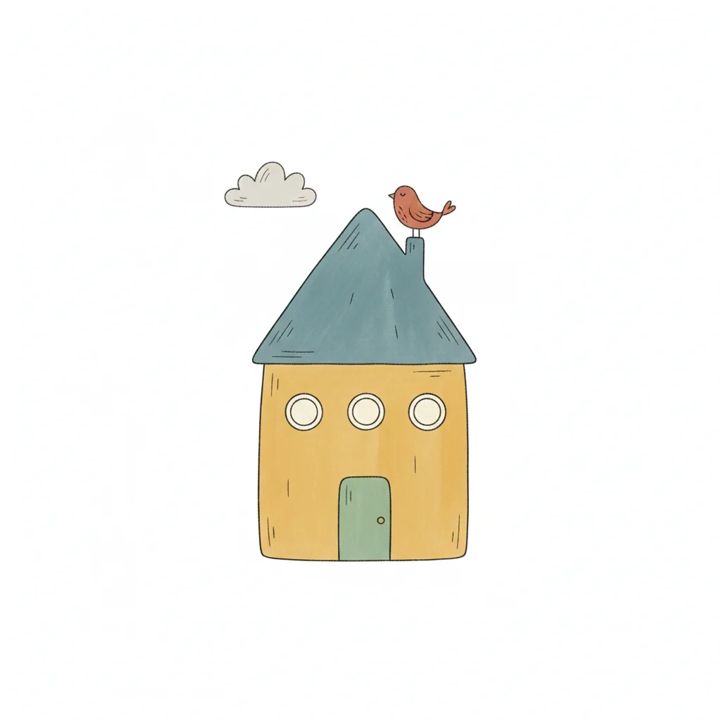 Niedliche, handgezeichnete Illustration eines gelben Hauses mit blauem Dach, Vogel und Wolke.