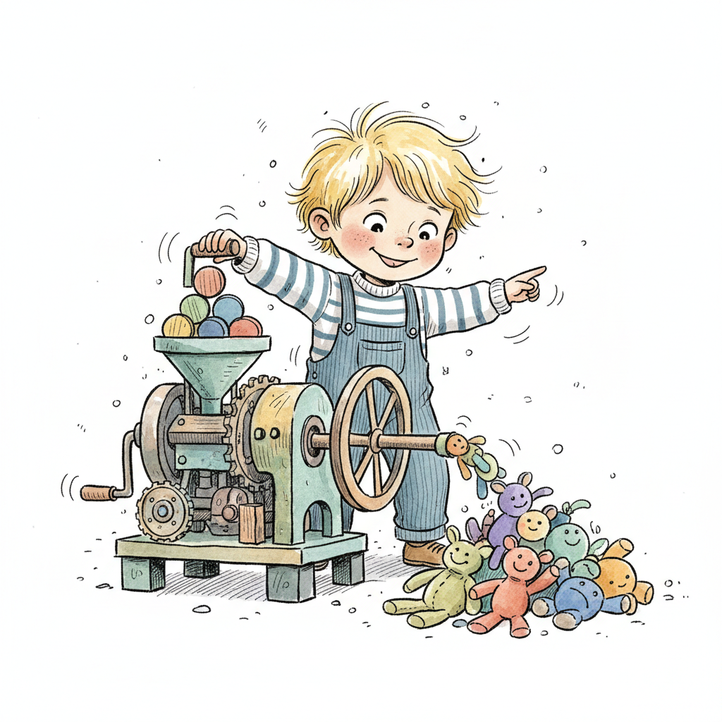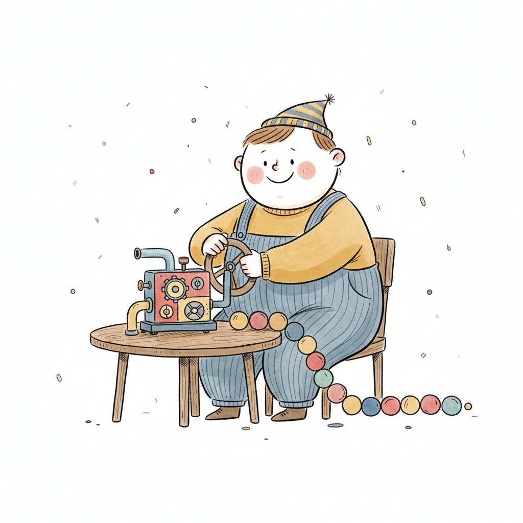 Ein lächelndes Kind in Latzhose und Mütze bedient eine Maschine, die bunte Perlen herstellt.