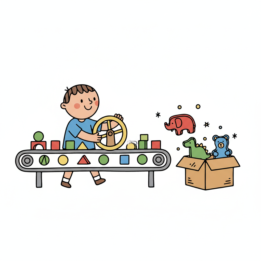 Kind steuert Förderband, das bunte Bausteine zu Spielzeug wie Elefant und Dino verarbeitet.
