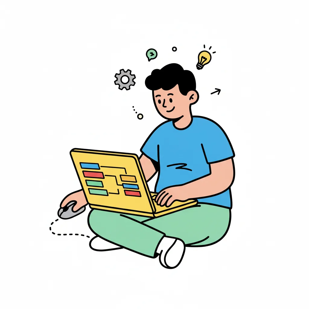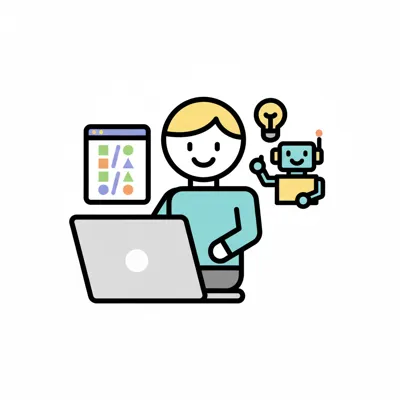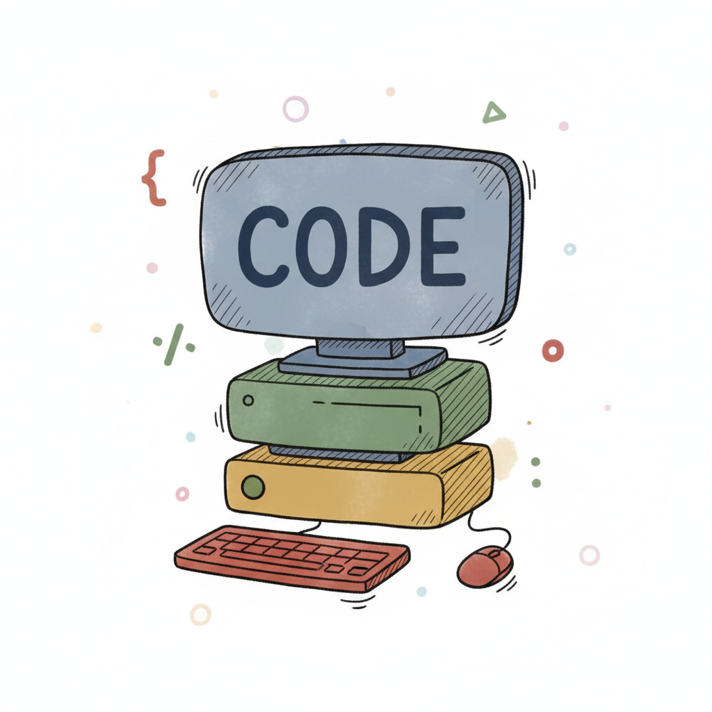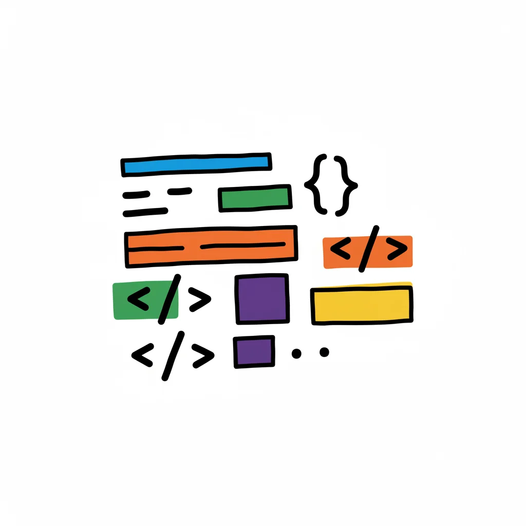 Bunte, handgezeichnete Illustration von Code-Elementen und UI-Komponenten mit Klammern und Tags.