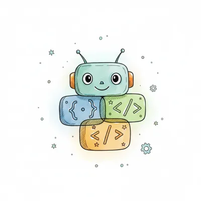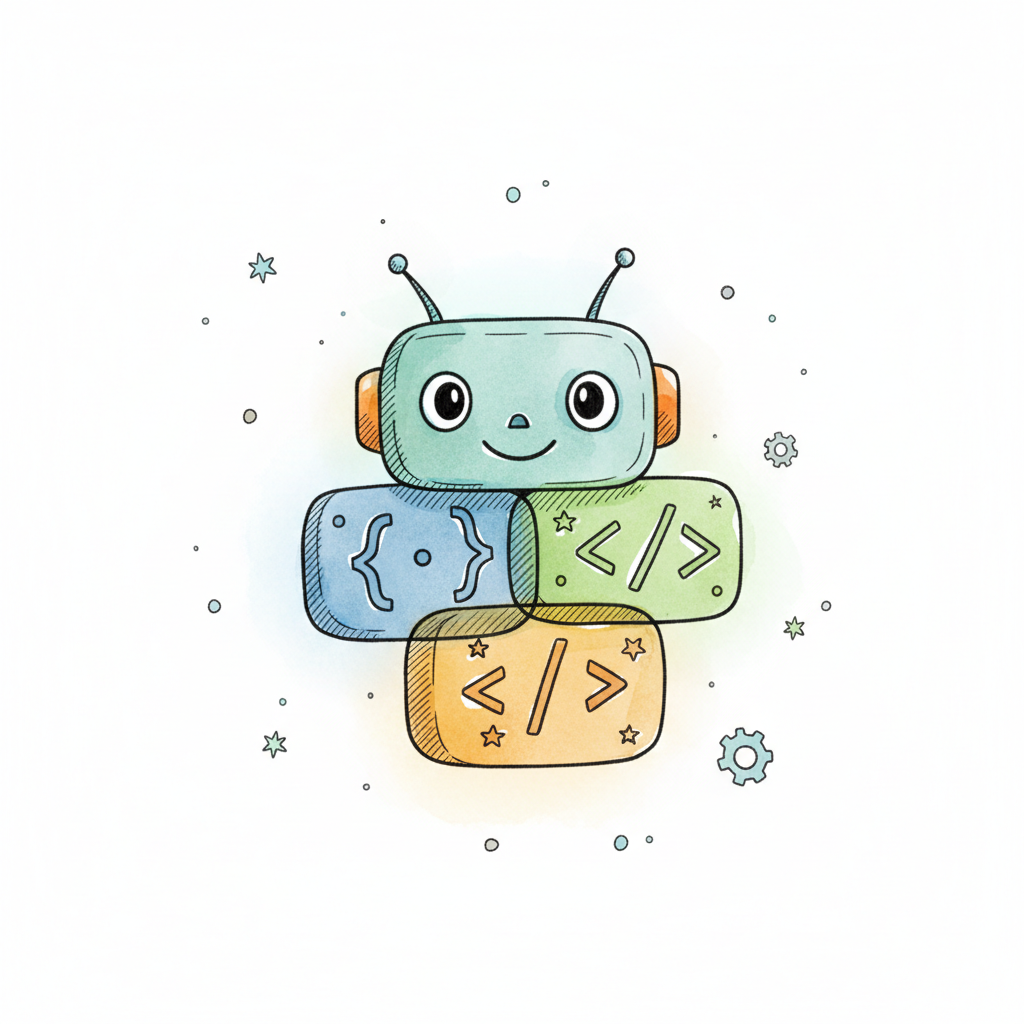 Niedlicher Roboter aus Code-Blöcken mit geschweiften und spitzen Klammern, im Cartoon-Stil.