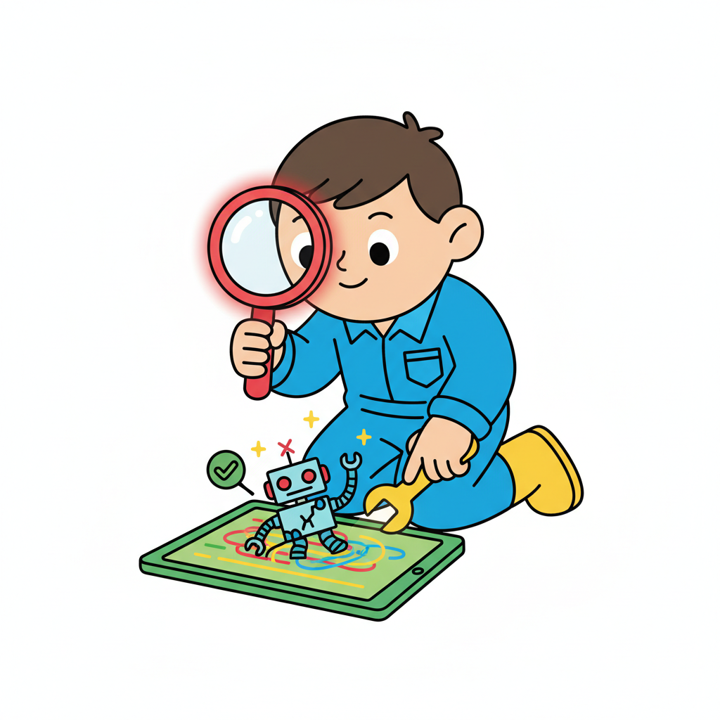 Junge im Blaumann untersucht mit Lupe einen Roboter und Code auf einem Tablet.