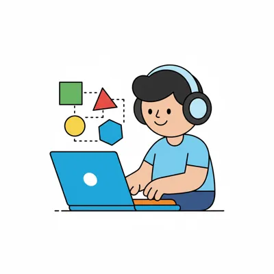Illustration: Person mit Kopfhörern arbeitet am Laptop, geometrische Formen symbolisieren Daten/Design.