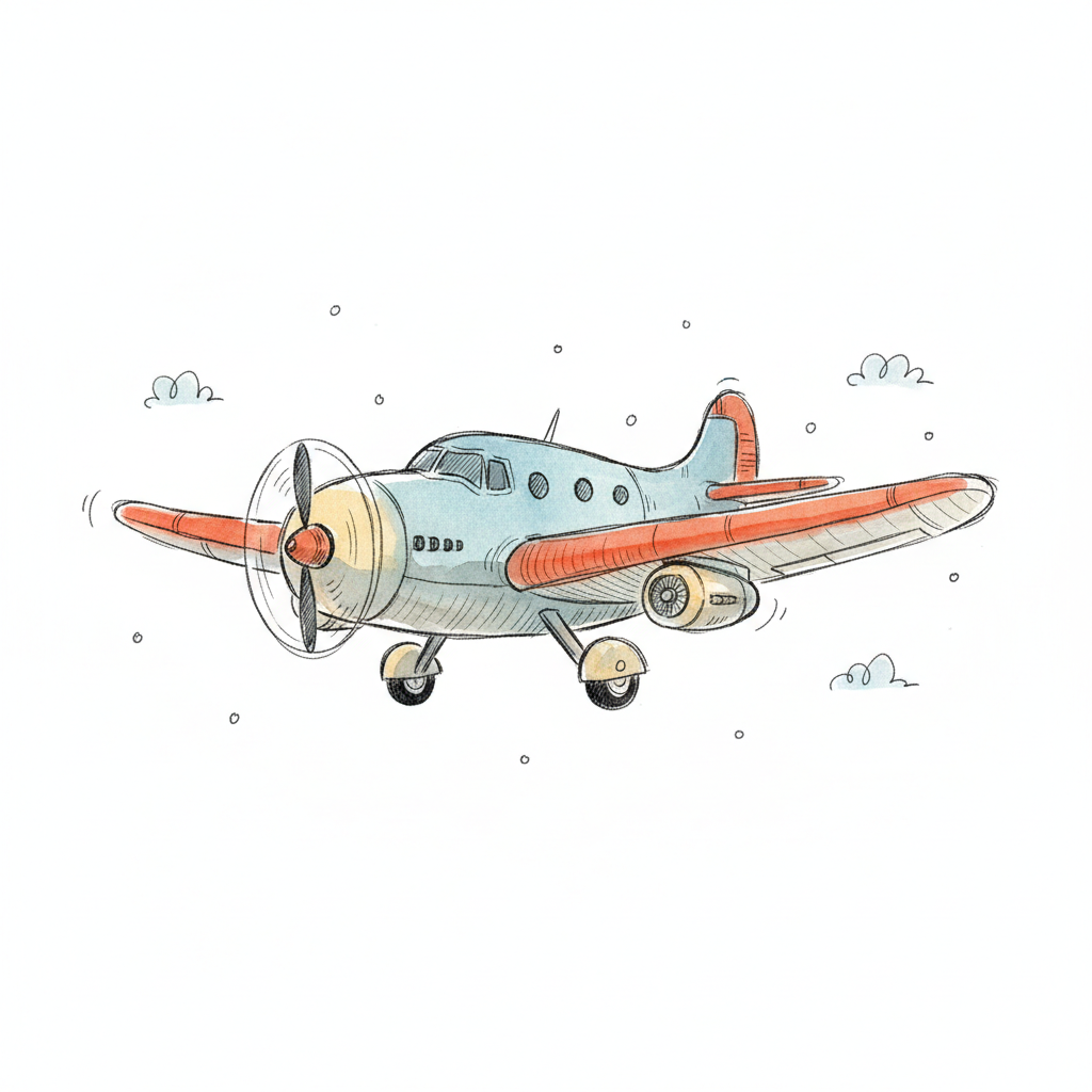 Ein skizziertes Flugzeug mit Propeller in einfacher Darstellung.