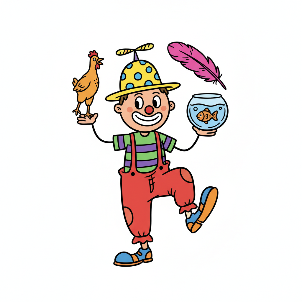 Bunter Cartoon-Clown balanciert Huhn und Goldfischglas, trägt Propellerhut.