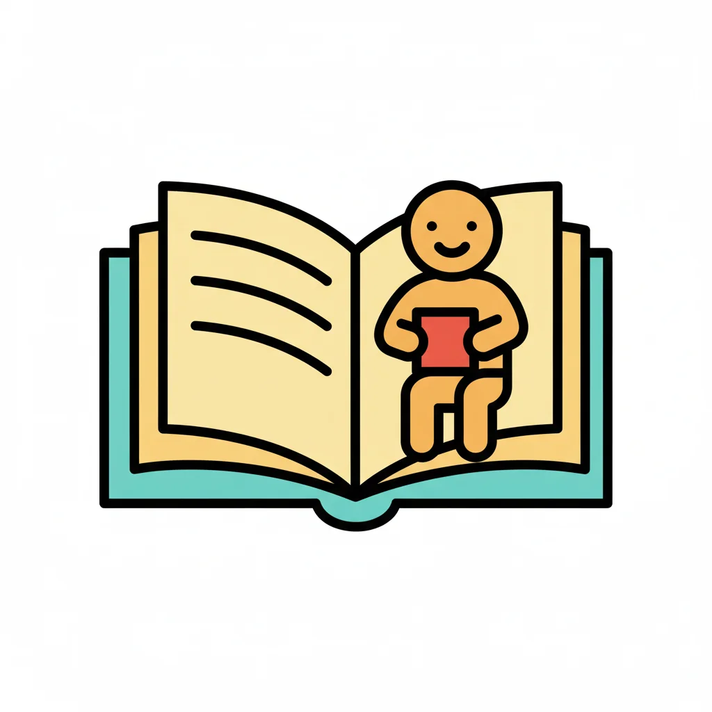 Ein lächelndes Männchen sitzt auf einem aufgeschlagenen Buch und liest ein kleines Buch.