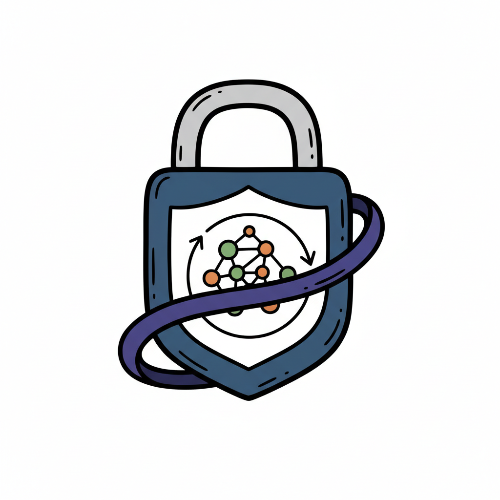 Cartoon-Vorhängeschloss mit Schild, das ein Netzwerk und Kreispfeile für Sicherheit/Prozess zeigt.