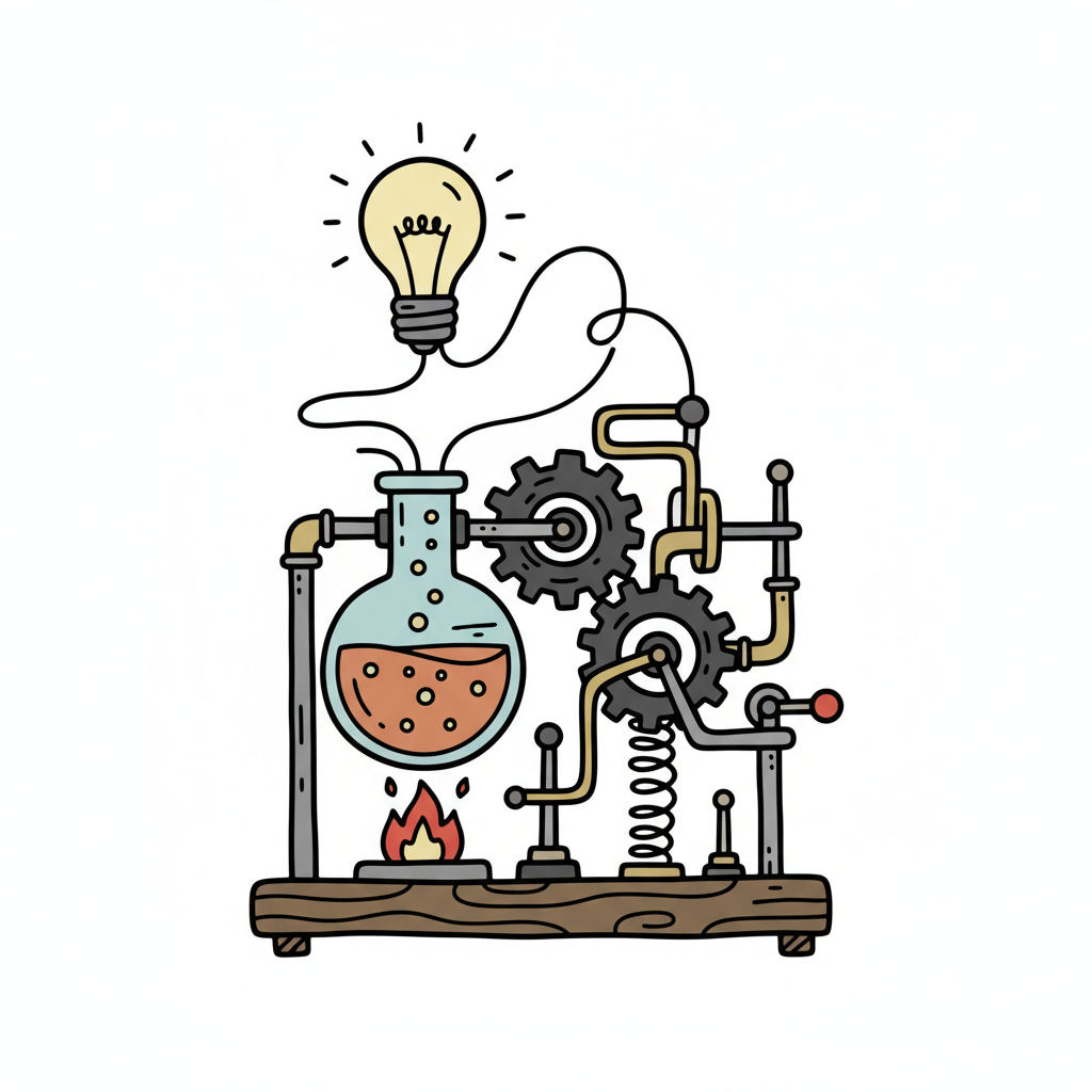 Kreativer Prozess: Eine komplexe Maschine erzeugt aus einer Flüssigkeit eine leuchtende Glühbirne.