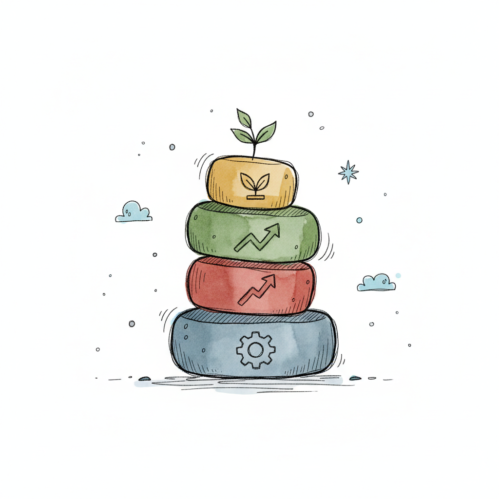 Farbige Blöcke mit Symbolen für Prozess, Wachstum und Entwicklung, gekrönt von einer Pflanze.