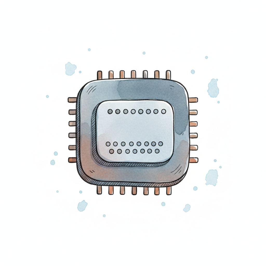 Grauer Computerchip im Aquarellstil mit Pins und zwei Reihen von Punkten auf der Oberfläche.