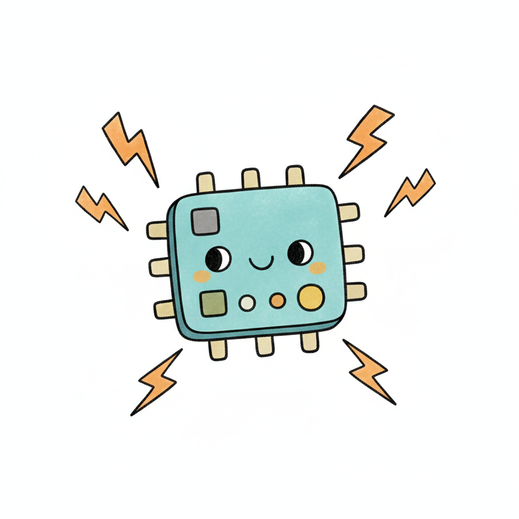 Ein süßer, lächelnder Mikrochip mit Blitzen, der Energie und Technologie darstellt.