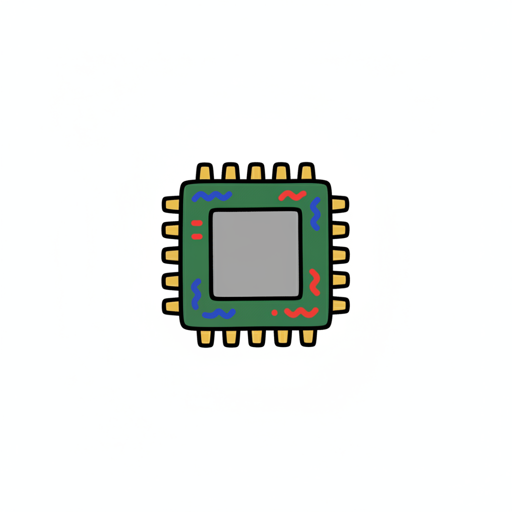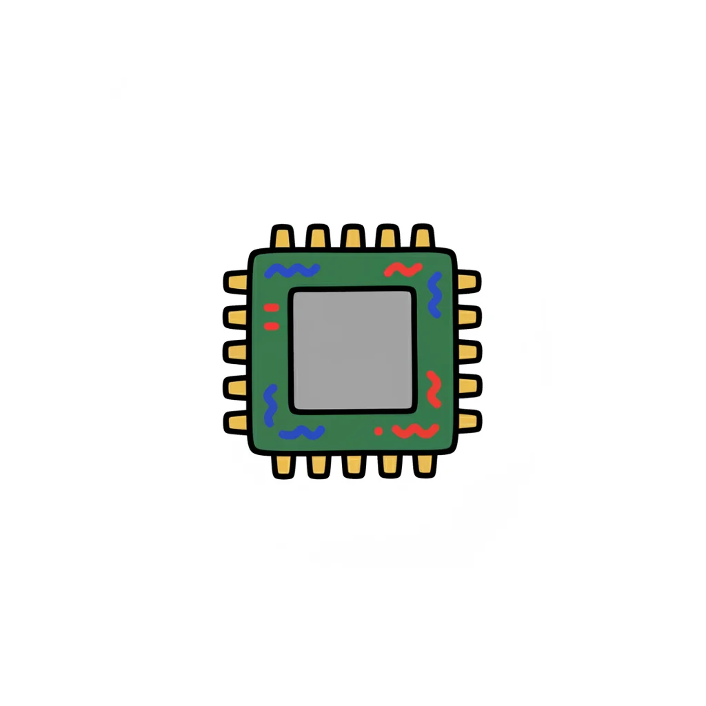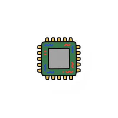 Cartoon-Mikrochip mit grüner Platine, grauem Kern und goldenen Anschlüssen auf weißem Grund.