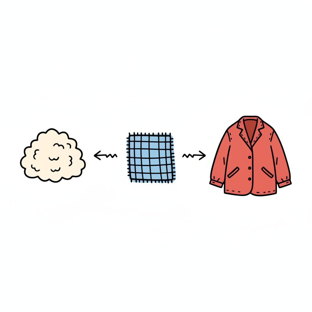 Prozess von Rohmaterial zu Stoff und dann zu einem Kleidungsstück, mit Recycling-Option für Stoff.