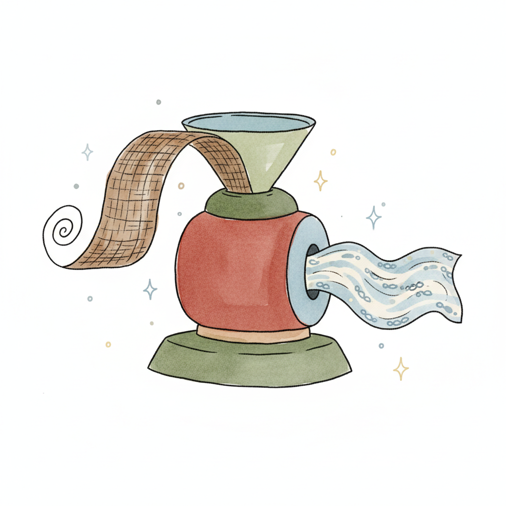 Aquarell-Illustration einer Maschine, die ein strukturiertes Band in ein welliges, gemustertes verwandelt.